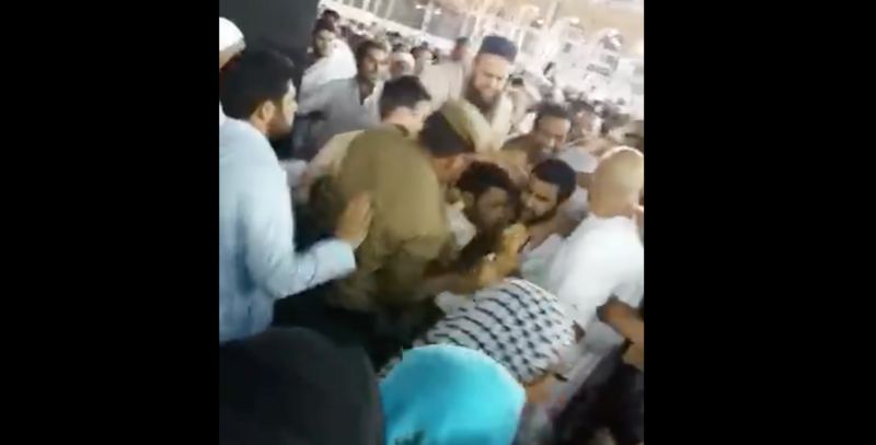 ويظهر في الفيديو عناصر من أمن الحرم ومعتمرون يلقون القبض على شخص عند الكعبة يحاول سكب البنزين على ستارها من قارورة.