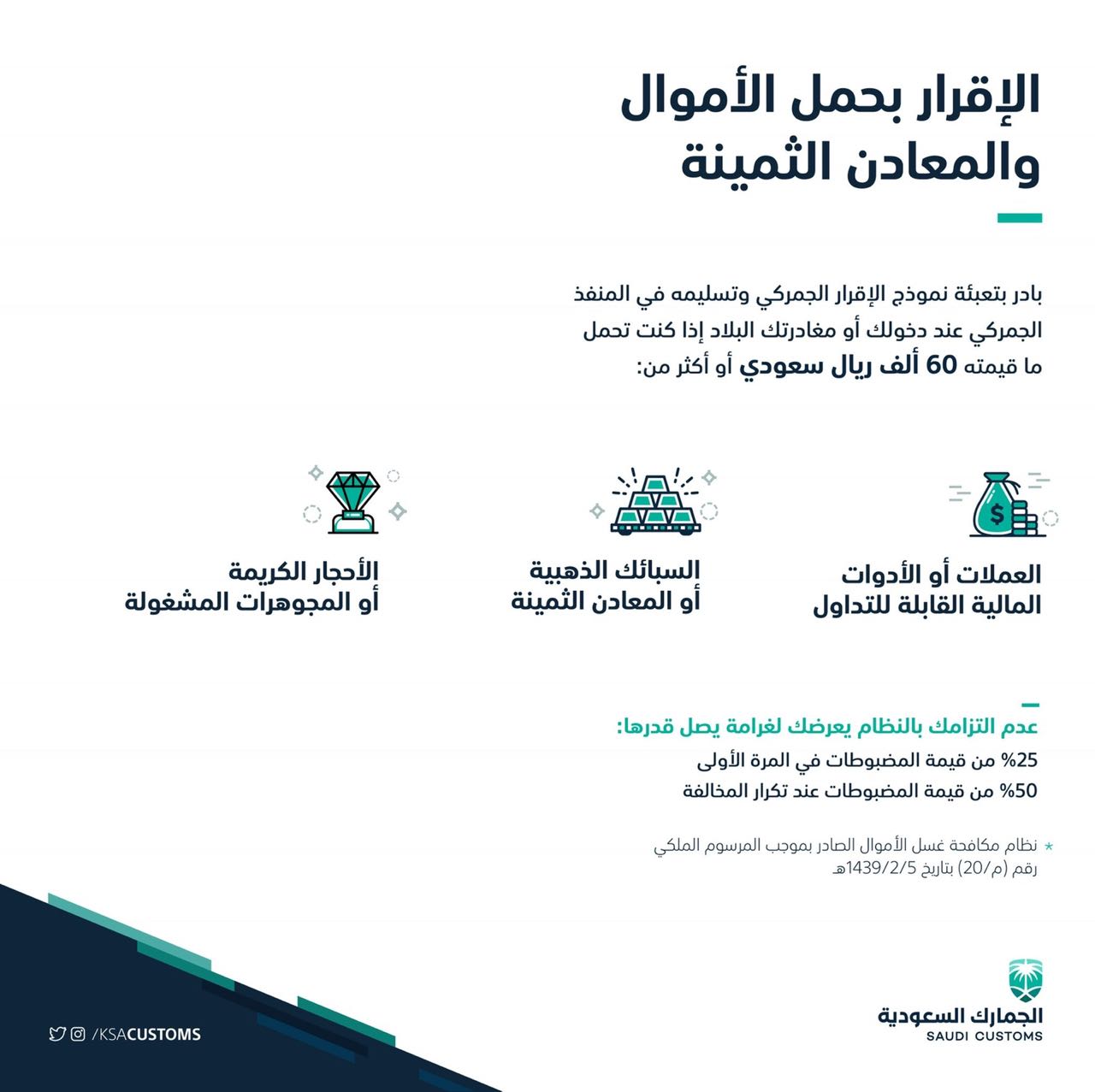الجمارك السعودية On Twitter وعليكم السلام يلزم الإفصاح وتعبئة نموذج الإقرار للمسافرين عند دخولك أو مغادرتك البلاد إذا كنت تحمل ما قيمته٦٠ ألف ريال سعودي أو ما يعادلها من الأموال أو المجوهرات أو المعادن الثمينة يسعدنا خدمتك Https T Co Me6ggb7plf