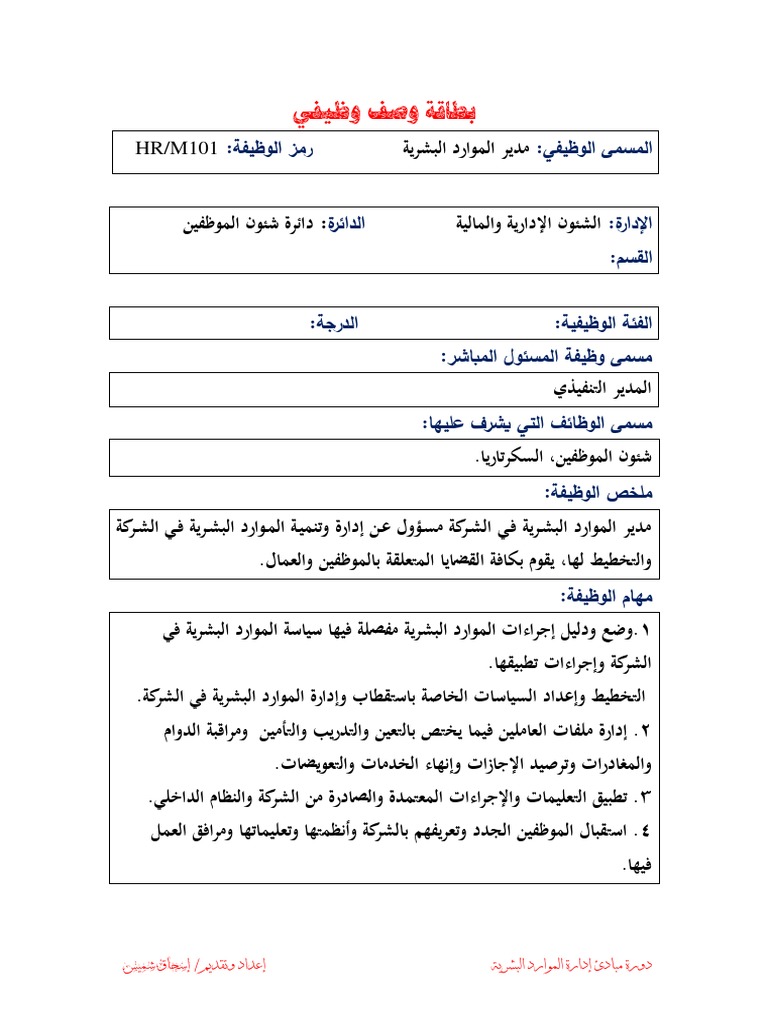 الوصف الوظيفي لمدير الموارد البشرية Doc