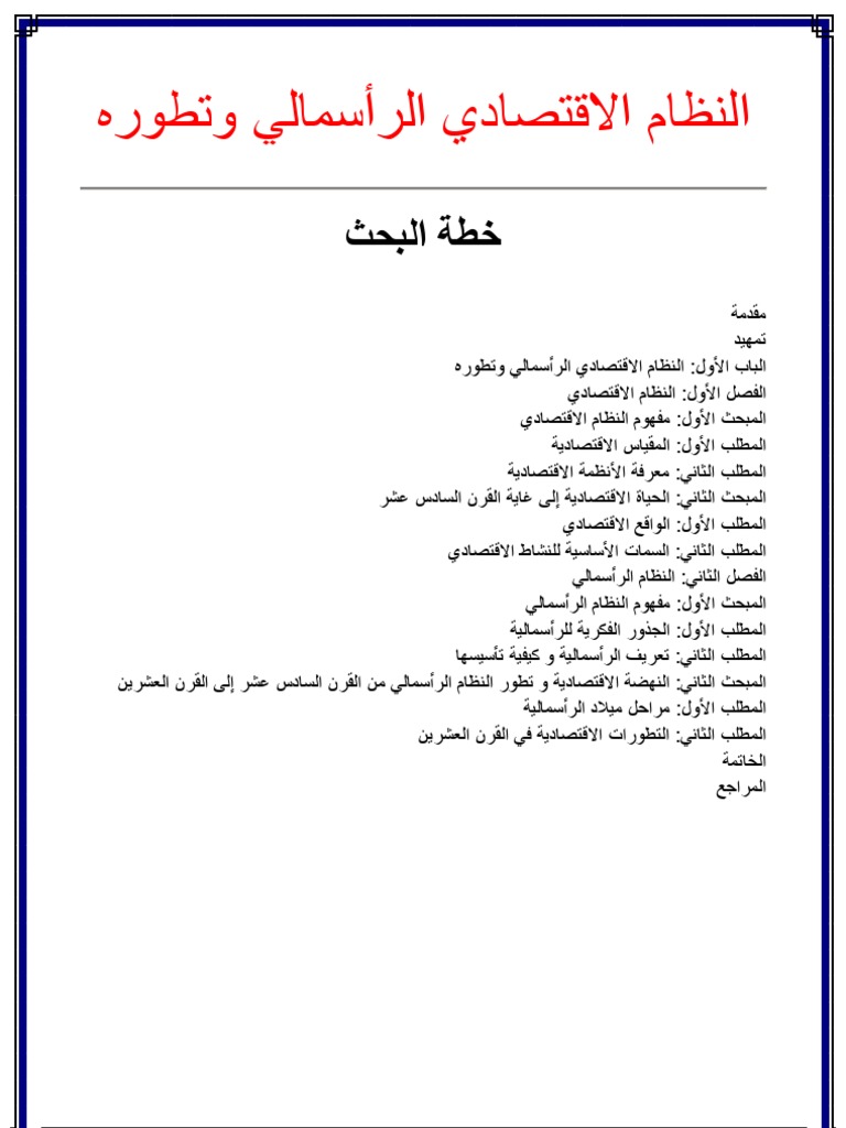 بحث حول النظام الرأسمالي خطة البحث. النظام الاقتصادي الرأسمالي هو ذلك النظام الذي يقوم على الملكية الفردية لعناصر الإنتاج والحرية الاقتصادية في إدارة وتسيير وممارسة النشاط الاقتصادي من خلال جهاز الثمن أو قوى السوق 1 فهو نظام اقتصادي ذو فلسفة اجتماعية وسياسية. بحث جاهز حول الرأسمالية الصناعية والتجارية. تعريف النظام الرأسمالي المطلب الثاني.